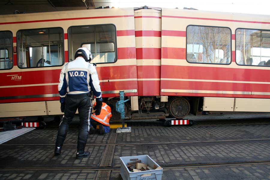 Daar werden twee asbreukwagentjes onder de tram geplaatst.