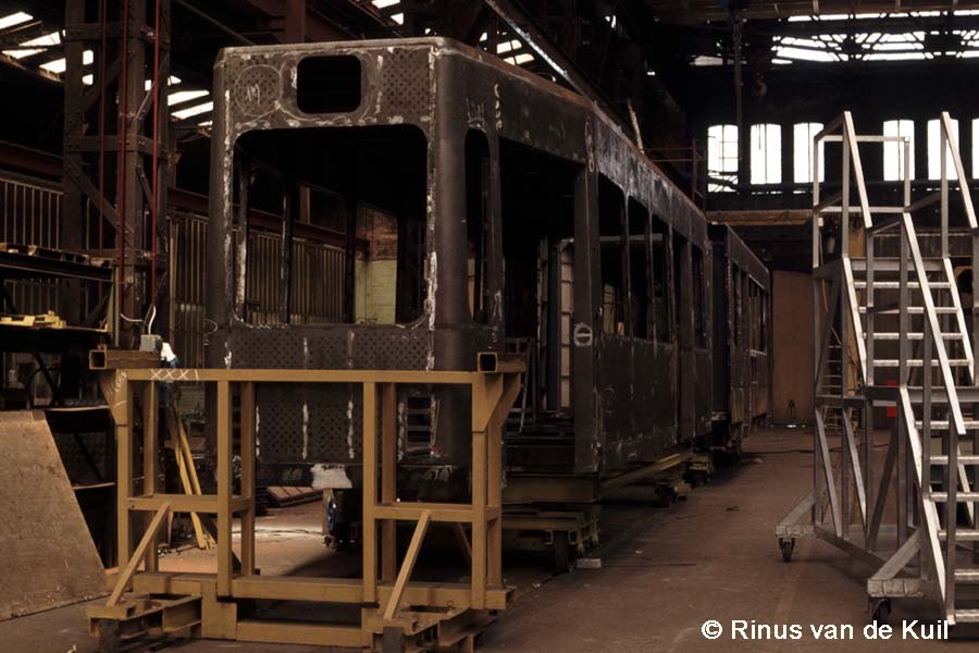 In de centrale werkplaats van de HTM aan de Lijsterbesstraat wordt hard gewerkt aan de ombouw van PCC 1315.