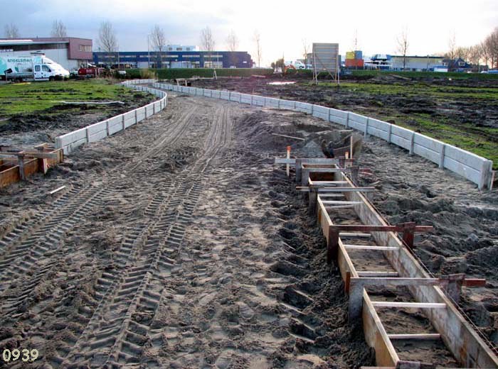 De betonnen randjes worden met een kraan ingehesen