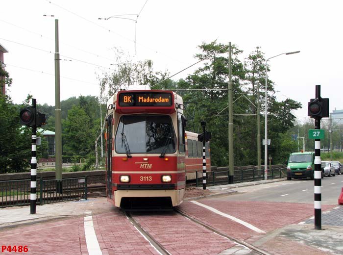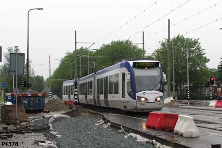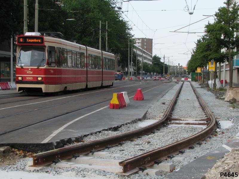Vanaf de Leyweg worden de tramlijnen RR4 en 6 direkt naar de zijkant van de Escamplaan geleid.