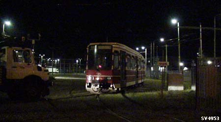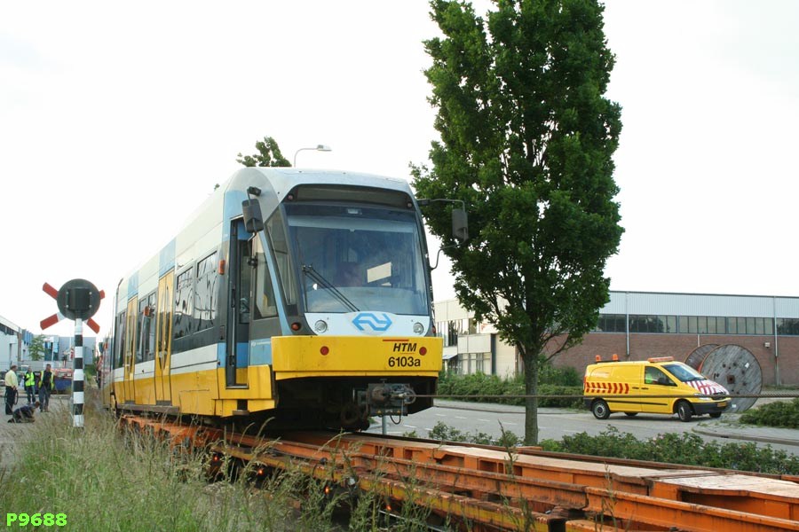 Rond de klok van 19:00 uur werd de 6103 door de Unimog van de HTM vanaf het remiseterrein over de NS sporen naar de Magazijnweg gesleept.