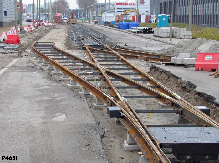 De overloopspoor met de daarbij behorende wissels liggen netjes in het verse beton.