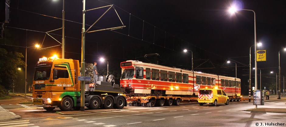 Omdat er tijdelijk geen railverbinding is tussen de werkplaatsen aan de Lijsterbesstraat en de werkplaats Zichtenburg worden er regelmatig trams uitgewisseld per truck.